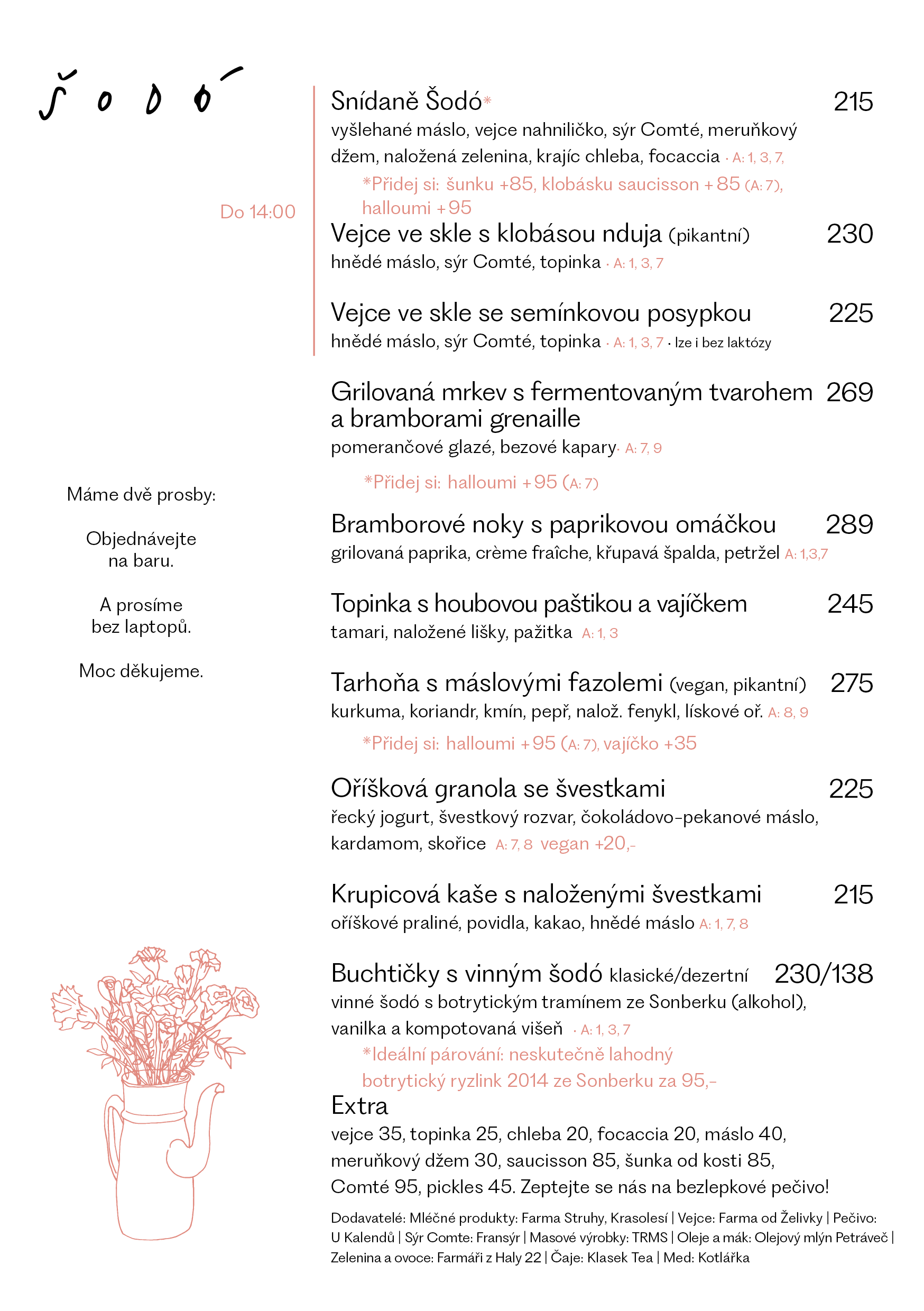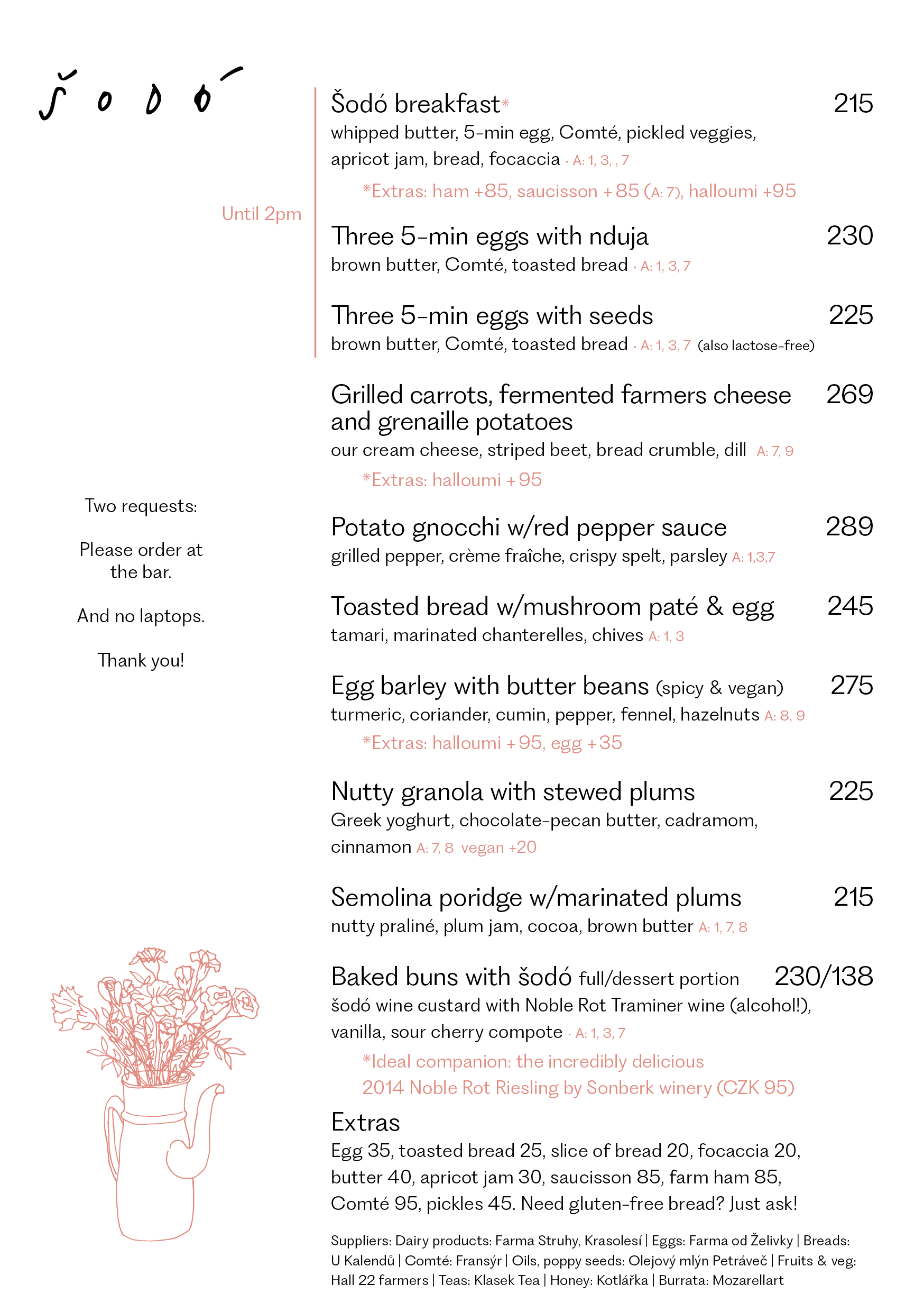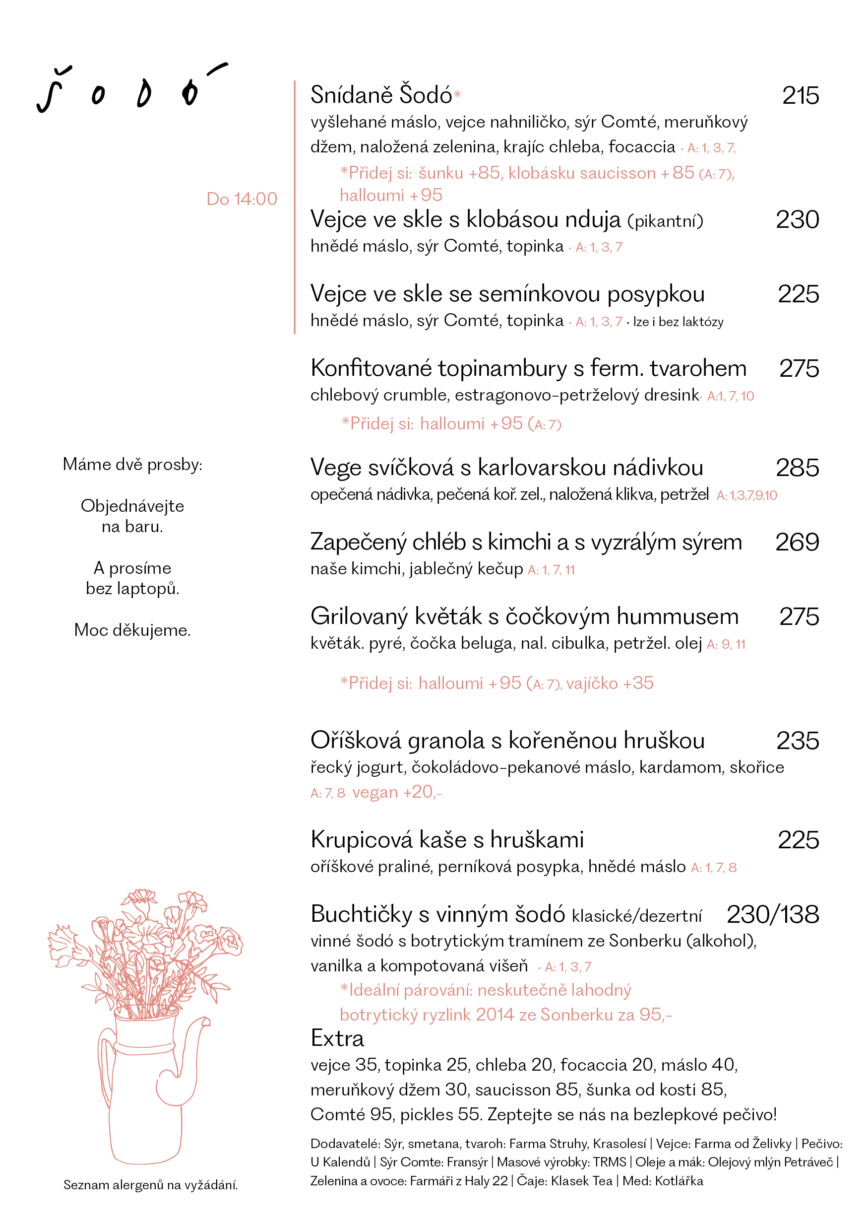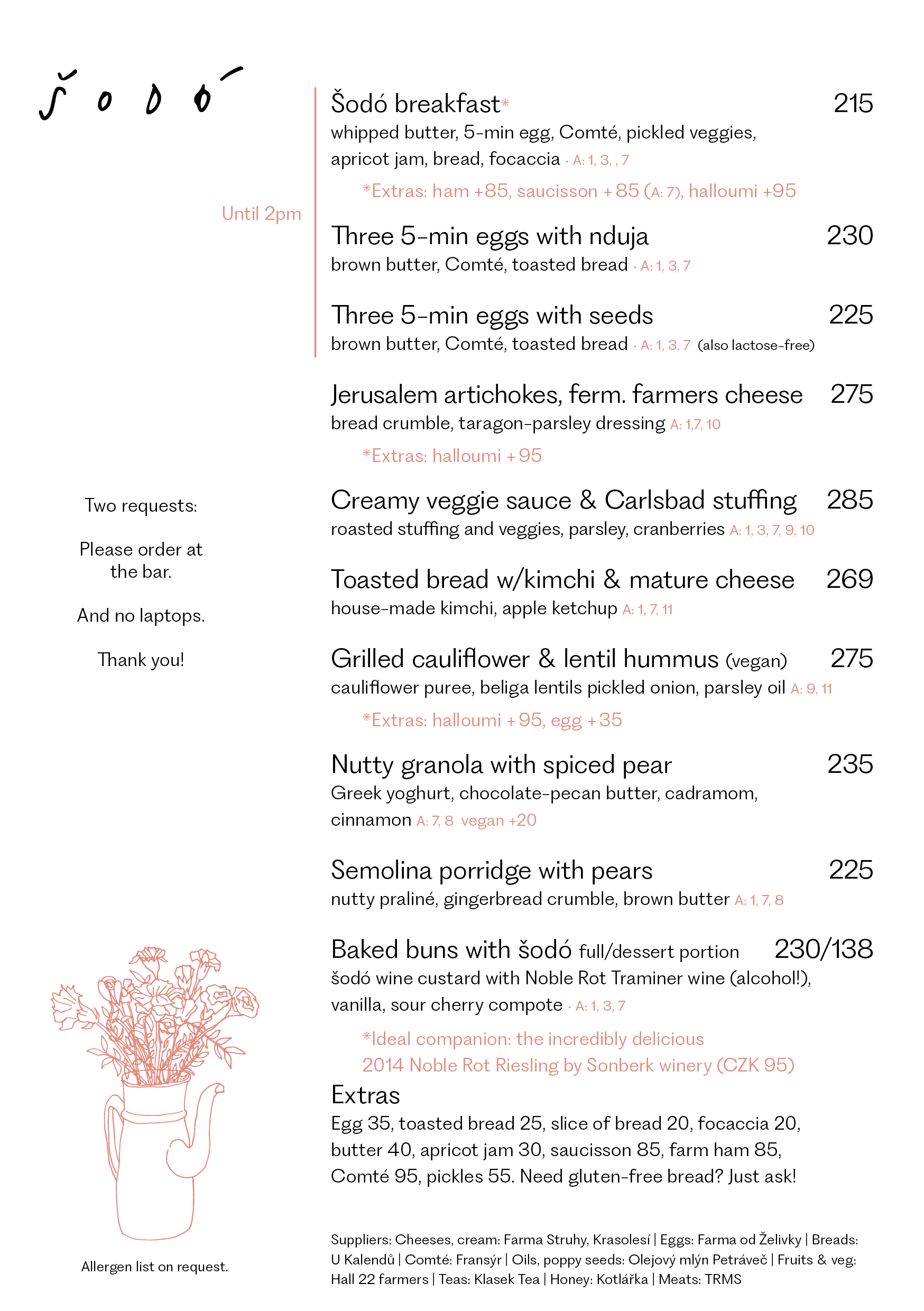For reservations call +420 602 361 188. You can reserve a table for the opening hour (8am Mo-Fr, 9am weekends) and from 2pm onwards. The reservation is for 90 minutes. Can't wait to see you!